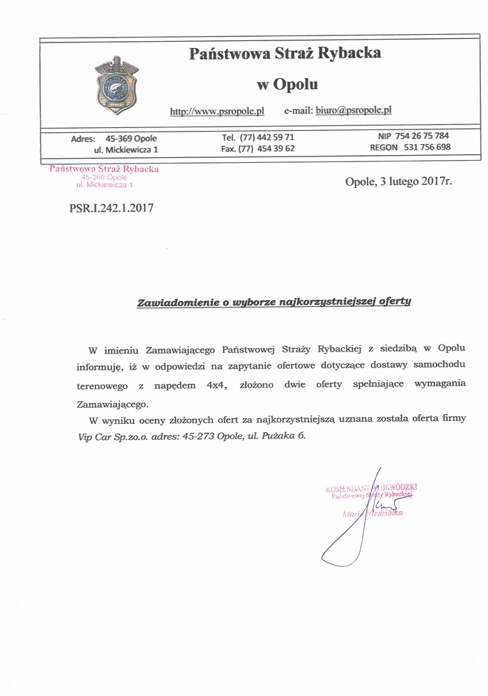 Informacja o wyniku postępowania w sprawie ,,Zapytania ofertowego" na dostawę zamochodu terenowego z napędem 4x4.